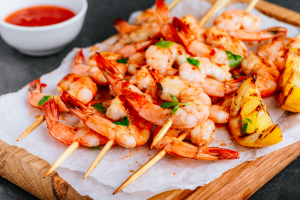 Coloque de 6 a 7 camarões em cada espeto.