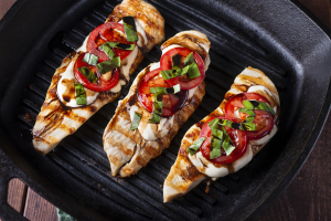 Após os 5 minutos, coloque os tomates sobre o frango e salpique muçarela. Feche a tampa e deixe o queijo derreter por 4 minutos.